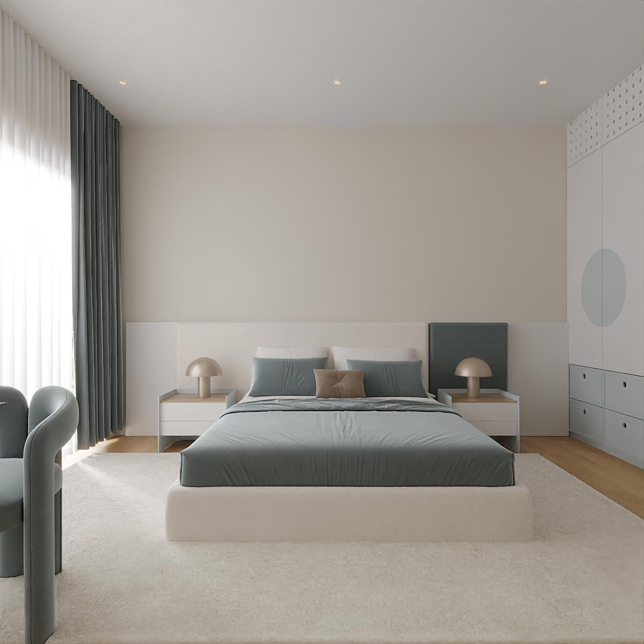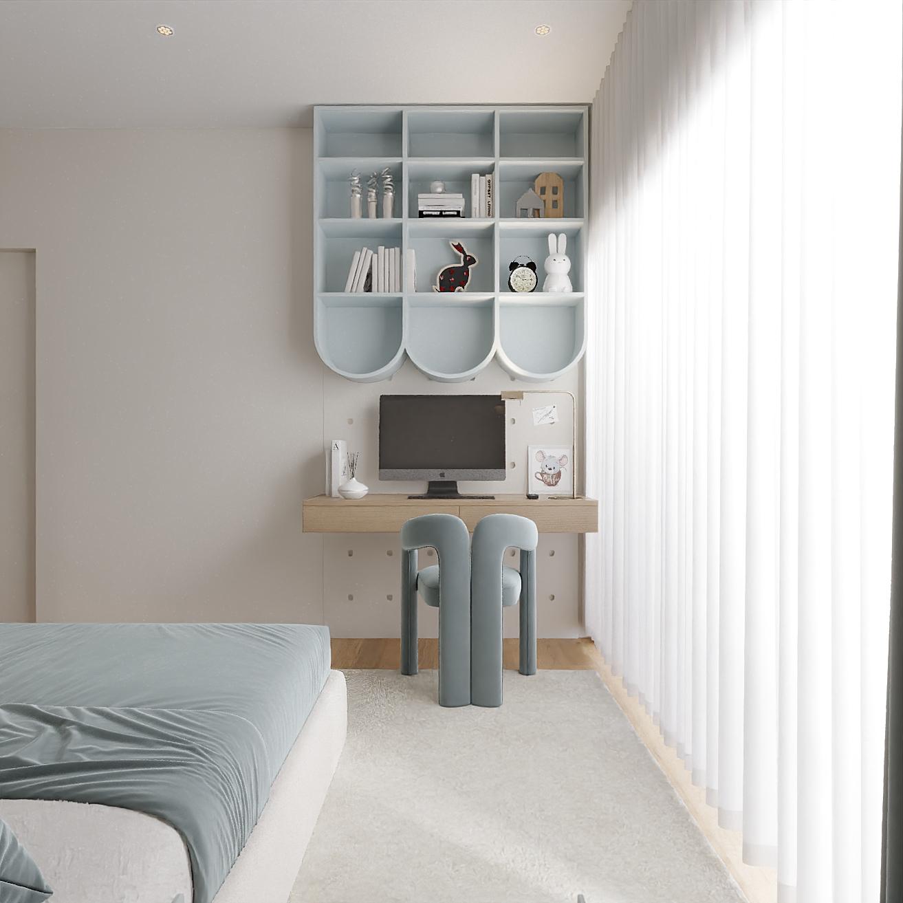 A zona de estudo, integrada de forma elegante e intuitiva, transforma o quarto num ambiente multifuncional, capaz de acompanhar diferentes momentos do dia — do descanso à criatividade. Os volumes suspensos, de linhas curvas e proporções equilibradas, acrescentam caráter e leveza arquitetónica, promovendo uma leitura visual contínua e organizada.