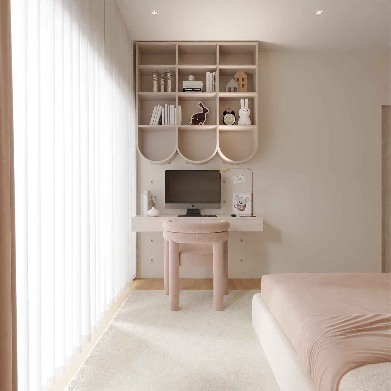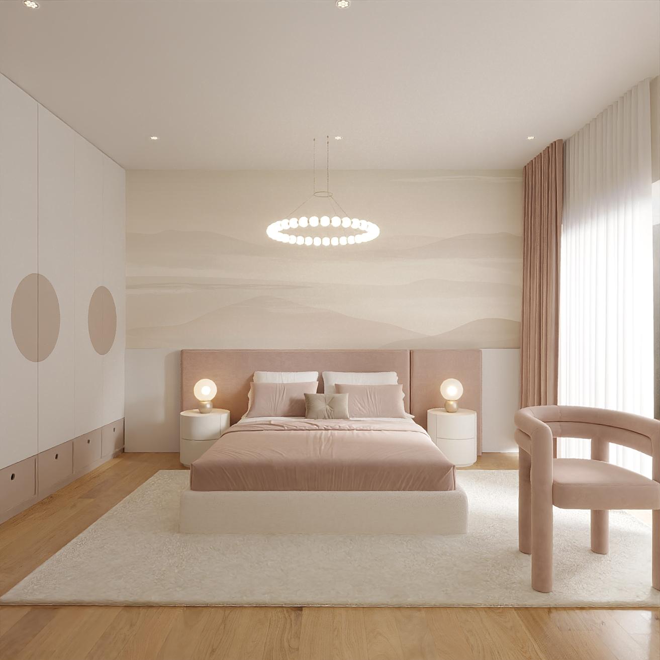Este quarto foi concebido como um refúgio feminino — um espaço onde a suavidade das formas encontra a força da identidade. A paleta salmão, envolvente e luminosa, cria uma atmosfera que inspira confiança, serenidade e expressão pessoal, enquanto os materiais naturais e as texturas aveludadas acrescentam profundidade sensorial e sofisticação.